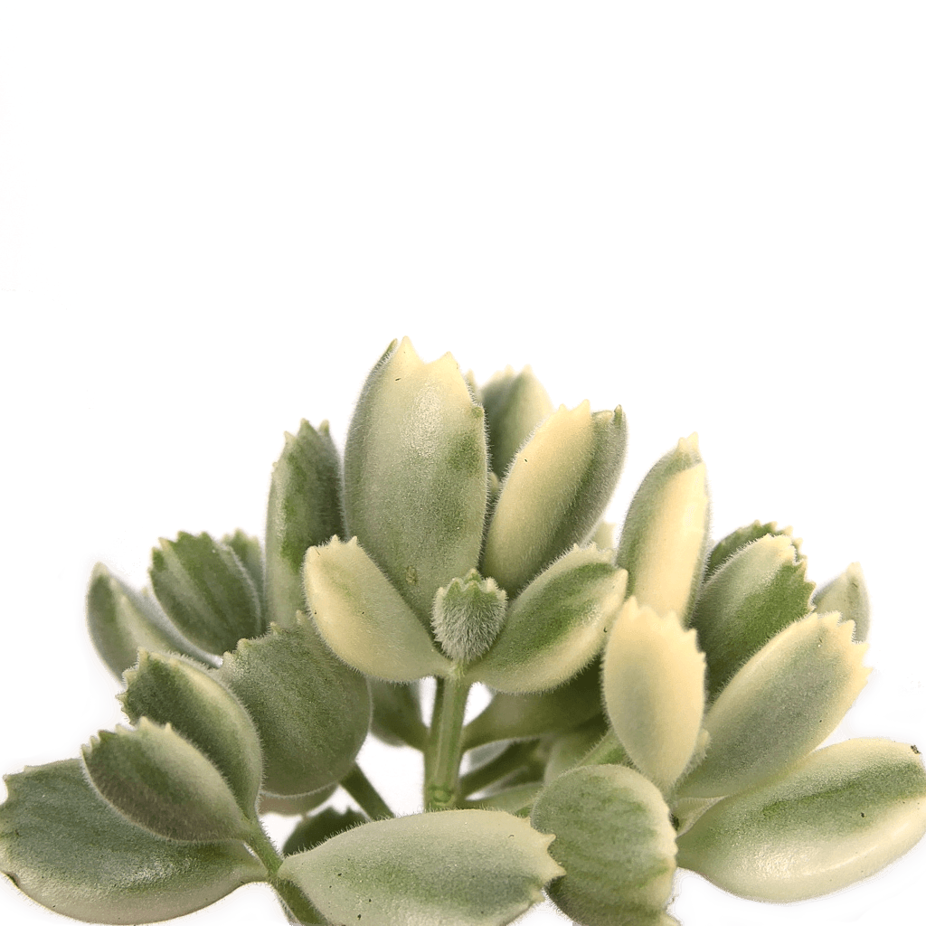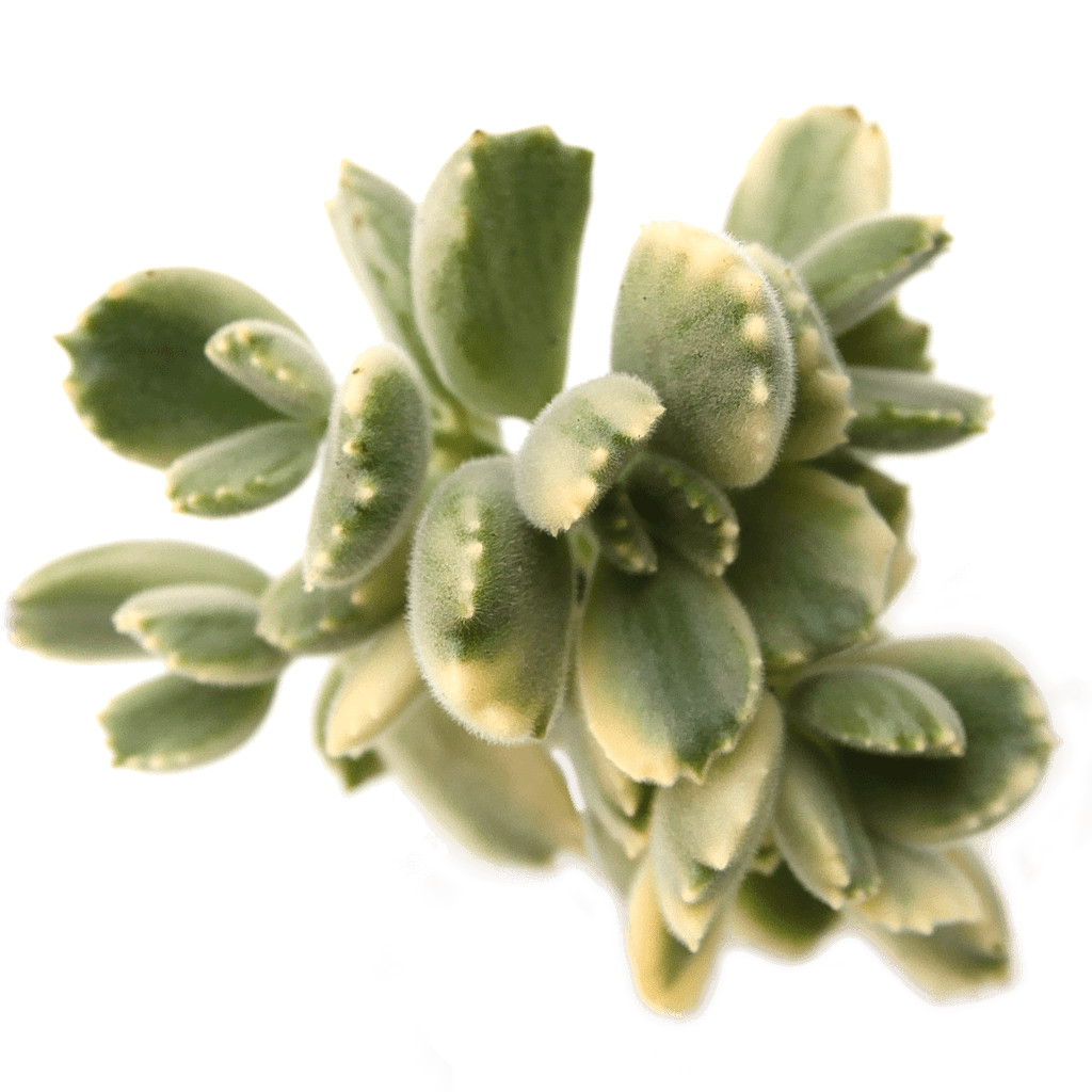 Cotyledon tomentosa 'Bear's Paw' variegata is a densely branched "shurblet" succulent, meaning that it features a branching, yet petite, growth pattern. Its green and cream variegated leaves are wedge-shaped, chubby, and coated in a layer of soft hairs which are nearly impossible to resist touching! Small, rounded teeth line the edges of each leaf, earning the plant the name of ‘Bear’s Paw,’ and often blush to a pinkish hue when exposed to high levels of light or cooler temperatures. Reaching up to 12 inches tall and wide, this variety makes a great ‘filler’ component in succulent arrangements.