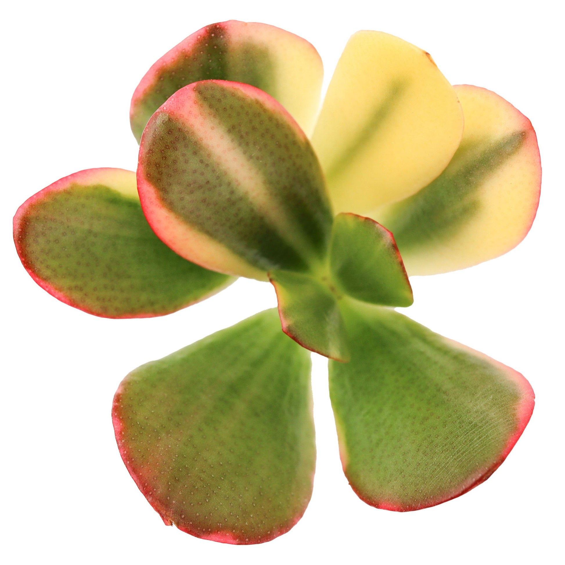 Behold the Crassula ovata f. variegata, a variegated gem among succulents, hailing from the rocky terrains of South Africa. This particular variety, often referred to as the 'Variegated Jade Plant', brings an exquisite palette of creamy white, green, and sometimes pink hues to its thick, fleshy leaves, which are a trademark of its resilience and water-storing abilities. The leaves' unique coloration is beautifully complemented by the plant's tendency to adopt a reddish tinge along its edges when exposed to bright sunlight, making it a vibrant addition to any indoor or outdoor garden.