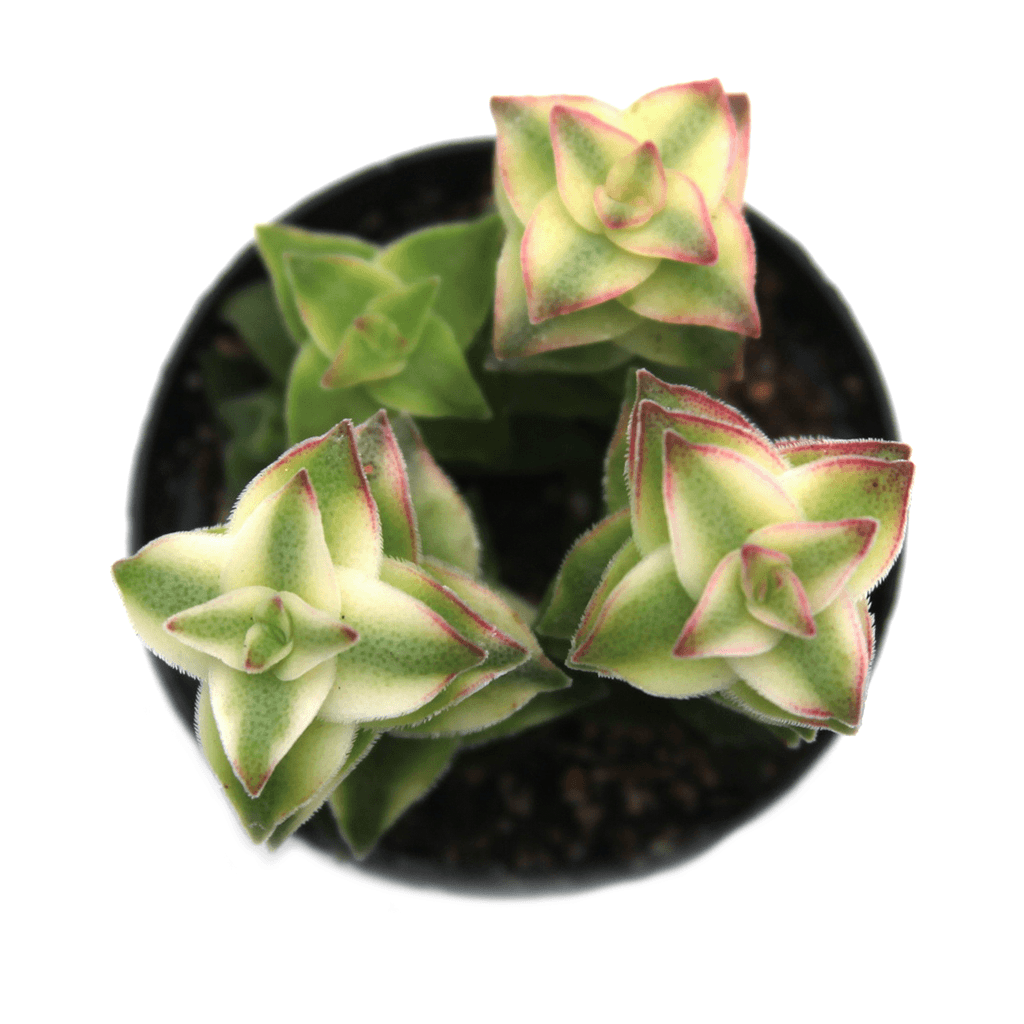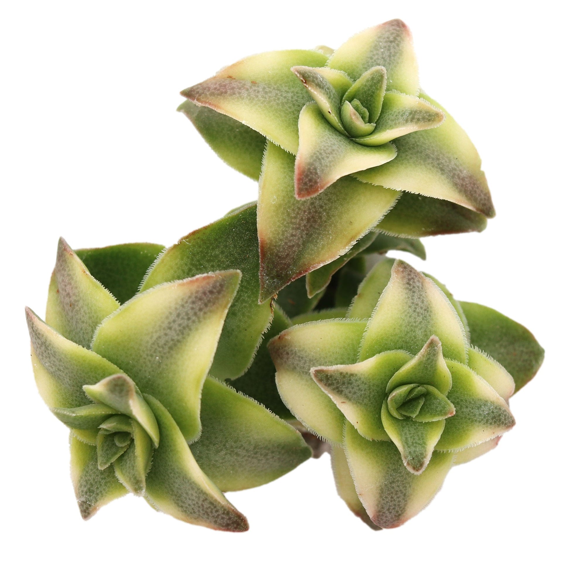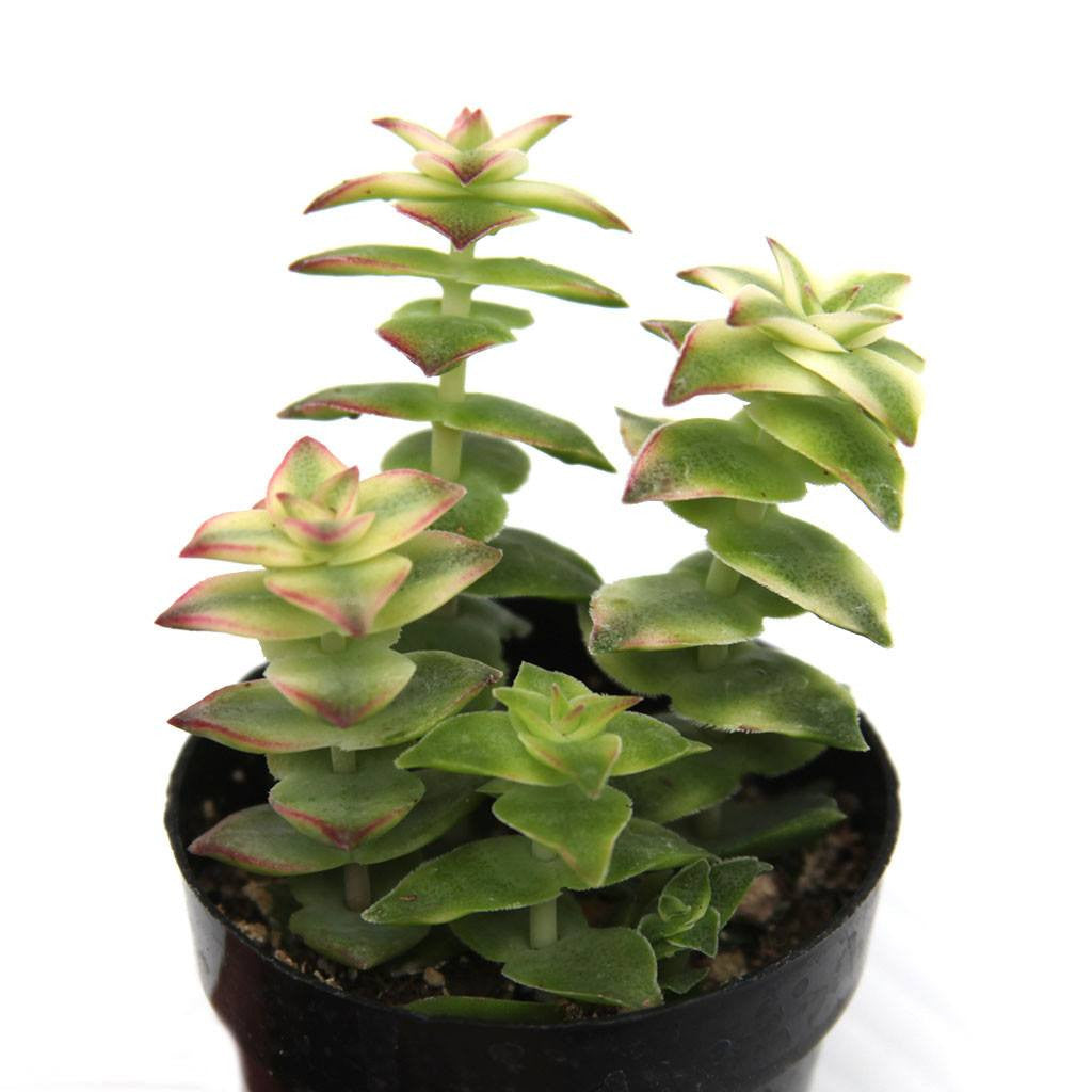 A variegated form of the ever-popular string of buttons,’ Crassula perforata f variegata leaves are creamy yellow with green striping down the midline of each leaf. When appropriately sun-stressed, the margins of each leaf will flush to pink, adding another layer of contrast to this charming variety. As each stem reaches its mature length of 10-12 inches, it will begin to softly drape, making this succulent an excellent ‘spiller’ addition to any arrangement or temperate rock garden.