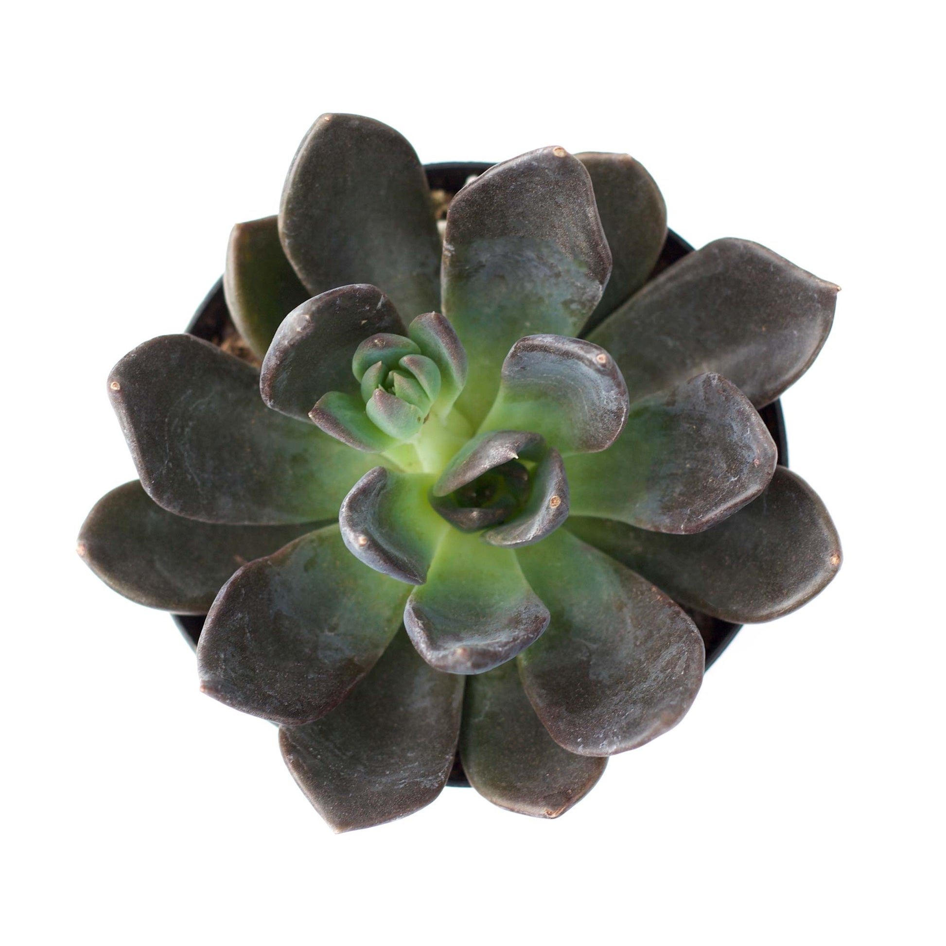 Sporting nearly black coloration on its thick, powdery leaves, the 6-inch rosettes of Echeveria ‘Dark Moon’ also include tones of deep blue and purple, making for an eye-catching succulent that creates the perfect contrast to lighter hued varieties when included in arrangements or rock gardens.