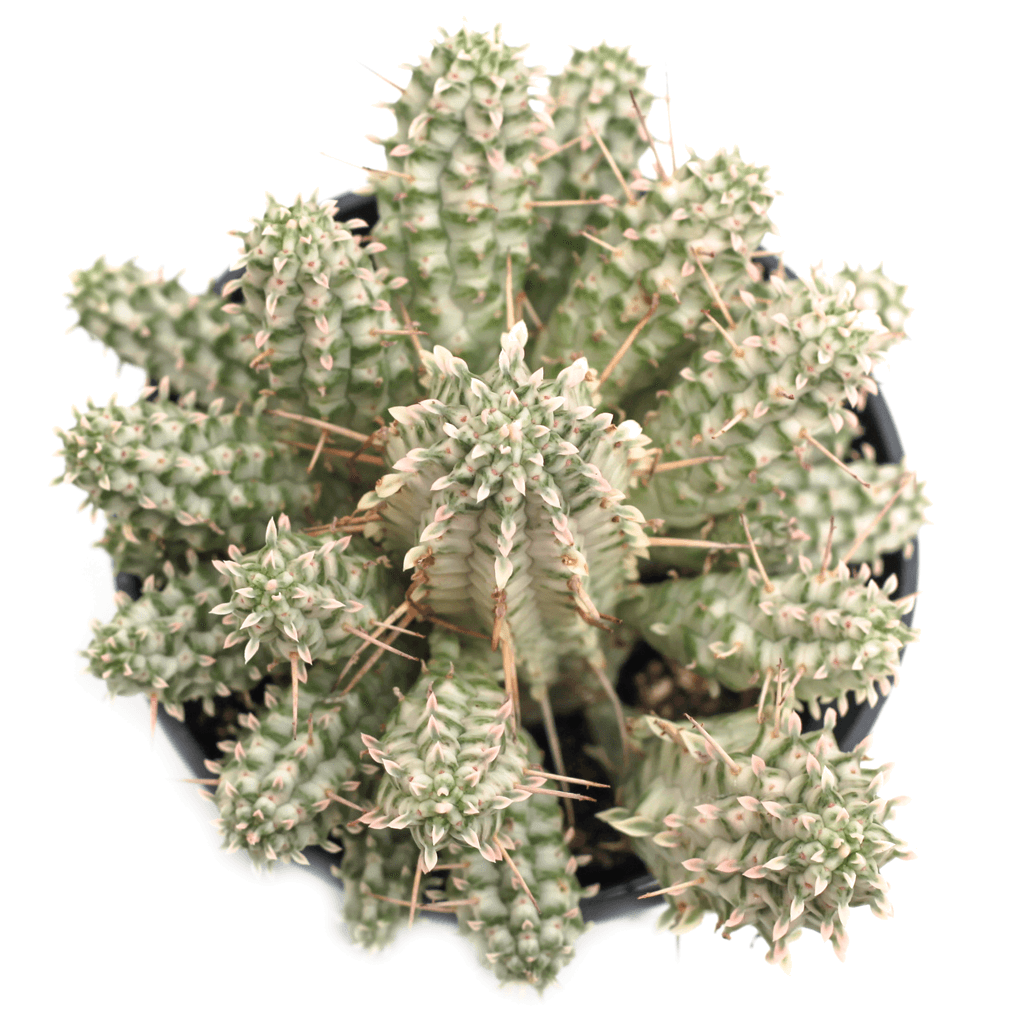 Euphorbia mammillaris f. variegata, also known by the common name variegated indian corncob, this cultivar truly does resemble just that! With ribbed stems reaching up to 14 inches in height, layered in hues of cream, light green, and even emerald, the real show occurs in bright sunlight when the tips of each stem begin to blush bright pink. Over time E. mammillaris f. variegata will produce a dense ‘shrublet’ of stems, making this variety an exceptional addition to container arrangements or temperate landscapes. Take care, however, when handling this variety, as it possesses both white spines and a sticky latex sap within its stems that can cause irritation when brought into contact with the skin. Use of gloves or even a thickly layered piece of newspaper will allow for safe and incident free potting of this eye-catching plant!