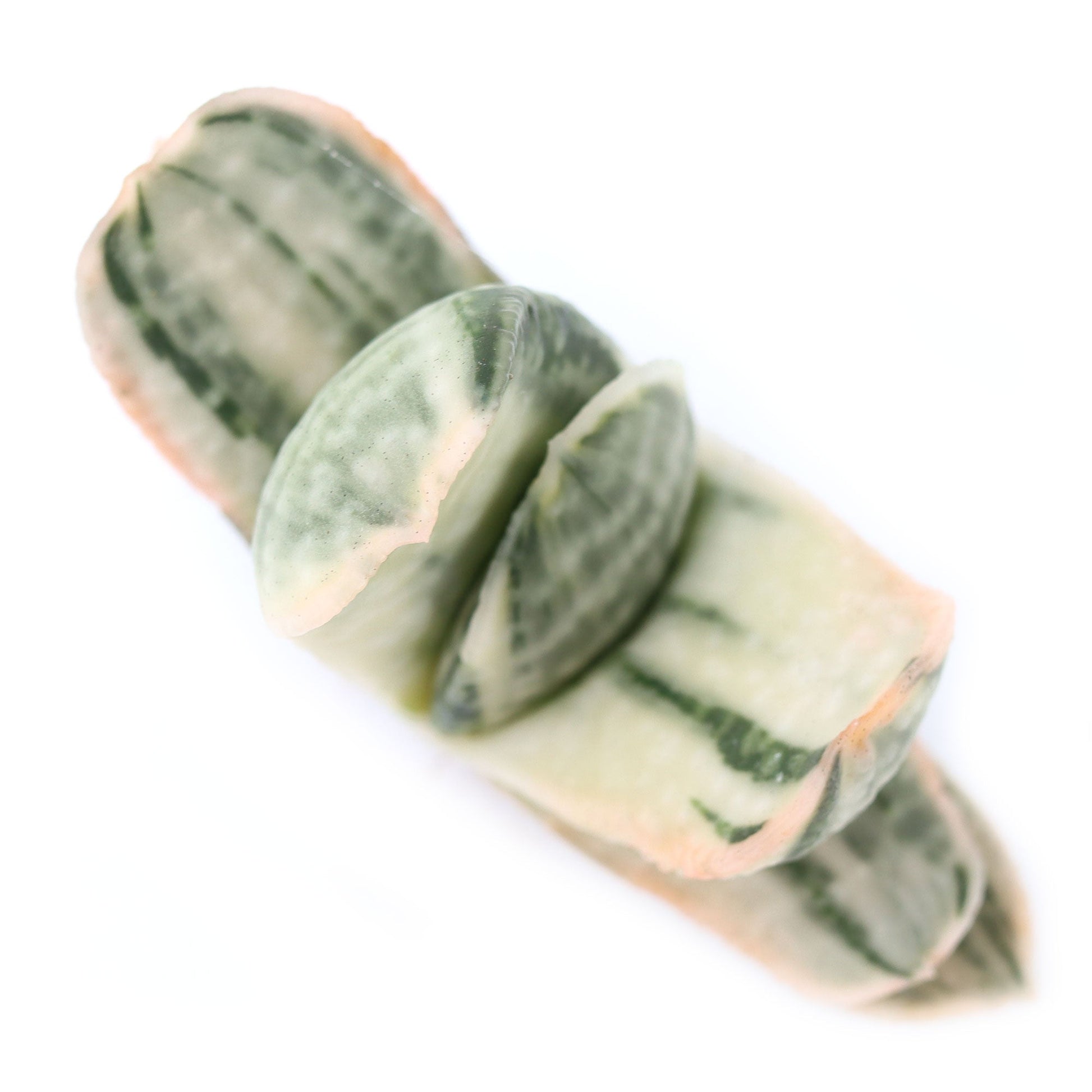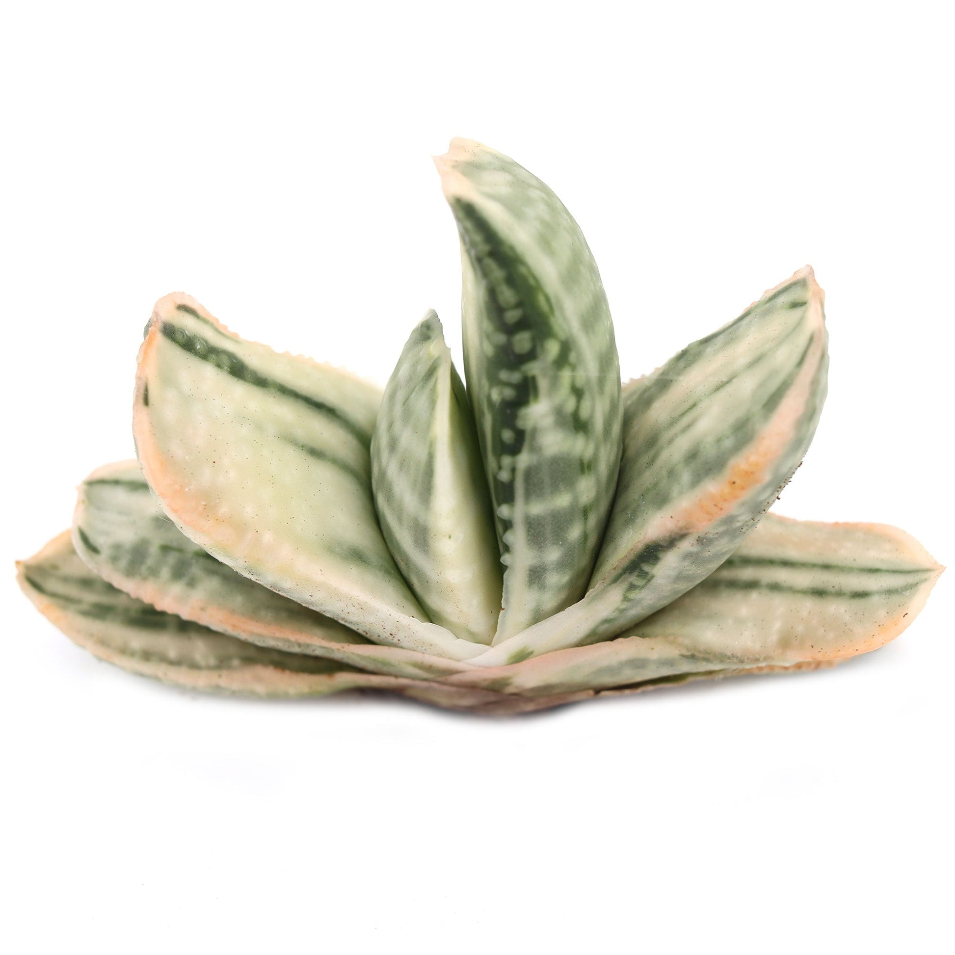 Stacked, tongue-shaped leaves emerge from a central point on the plant, fanning out in opposing directions instead of forming a traditional rosette shape. The leaves themselves are very thick and fleshy, striated with tones of deep green, light green, gray, and creamy white, and will together reach a maximum height of approximately 6 inches. Freely producing offsets from the base of the parent plant, over time this slow-growing variety will form a dense clump that will add a perfect layer of novelty and contrast to any succulent arrangement.