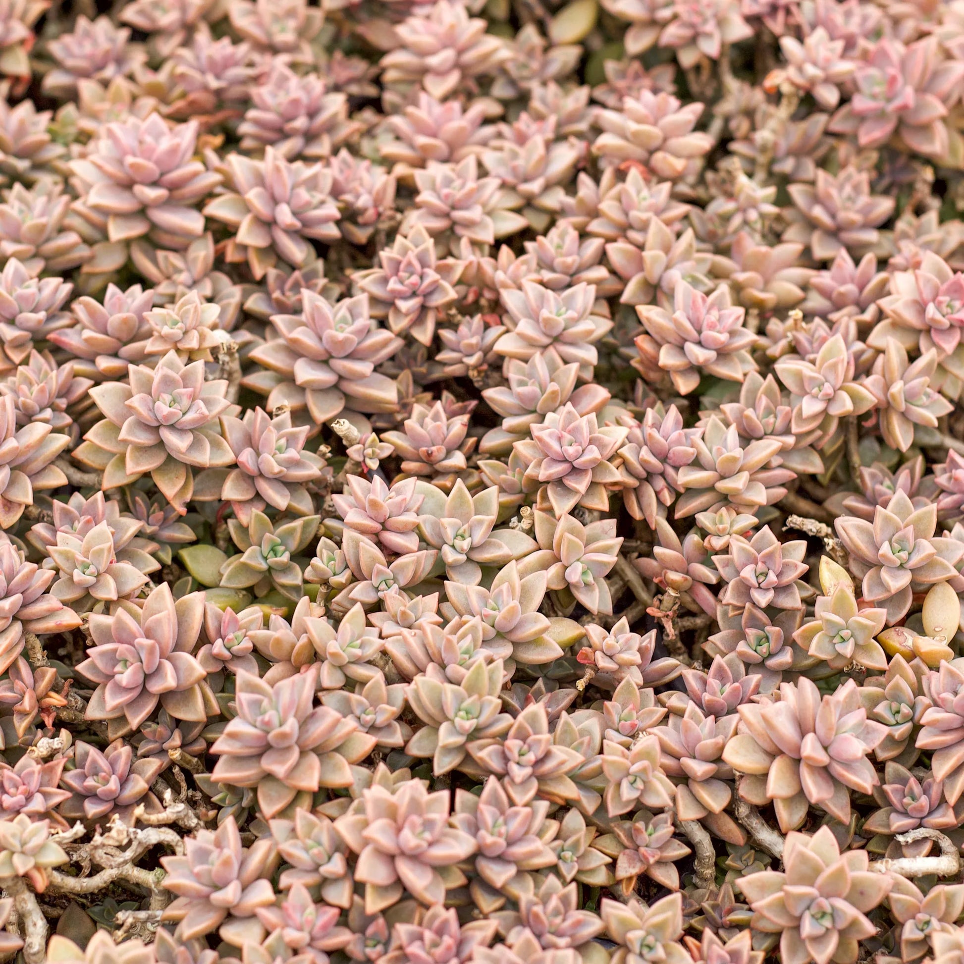 A hybrid succulent variety named for the famed British botanical artist and author, G. ‘Alpenglow’ sports fleshy leaves in shades of red, coral, or even bronze, which whorl around the stem before culminating in rosettes at the tip. The color of the 1- inch long leaves will deepen in stronger sunlight or cooler (but not freezing!) temperatures, and begin reverting to a silvery green in darker conditions. Growing to about 8-10 inches tall, the stems will begin to drape over the edges of the pot, making for a particularly eye-catching arrangement.