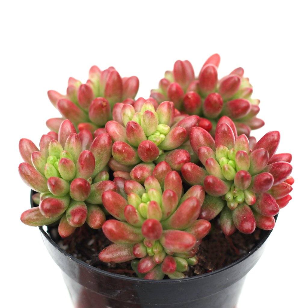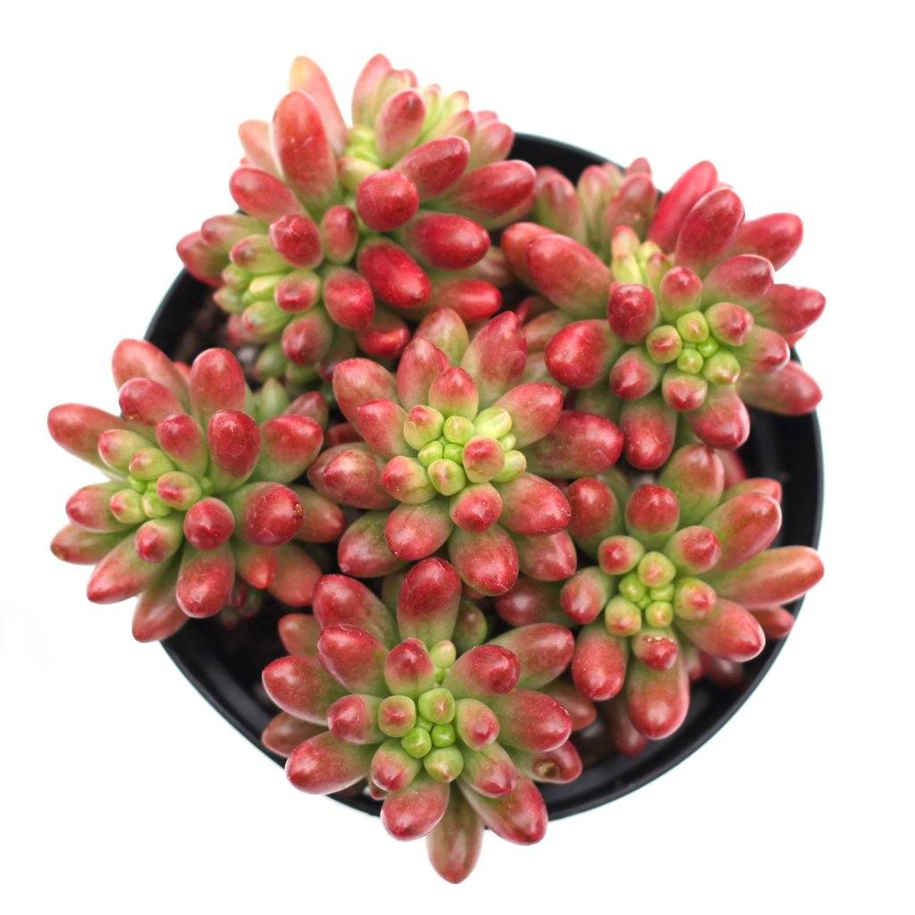 Sedum 'Aurora', otherwise known as the ‘Pink Jelly Bean’ plant, is a variety of sedum from Mexico. With a taller growth habit that will begin to drape as each stem reaches its full length, ‘Aurora’ features rounded, lime green leaves with hot pink tips – the tone of which will deepen in bright sunlight. While each stem reaches a height of only six inches tall, the clumping nature of this plant means that it can readily fill a pot or corner of the rock garden (in temperate climates) of up to three feet wide!